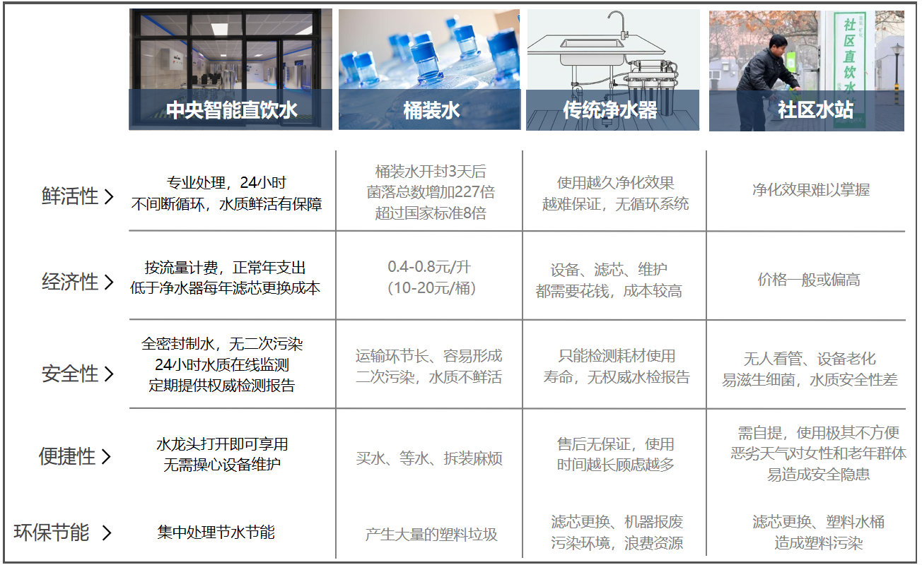 事實上,高品質、高體驗的飲用水需求隨著社會經(jīng)濟的發(fā)展和人們健康飲水意識的加強已經(jīng)變得越來越旺盛。這也是為什么近年來凈水器、小區(qū)的售水站、桶裝水瓶裝水等逐漸滲透到老百姓生活當中的原因。